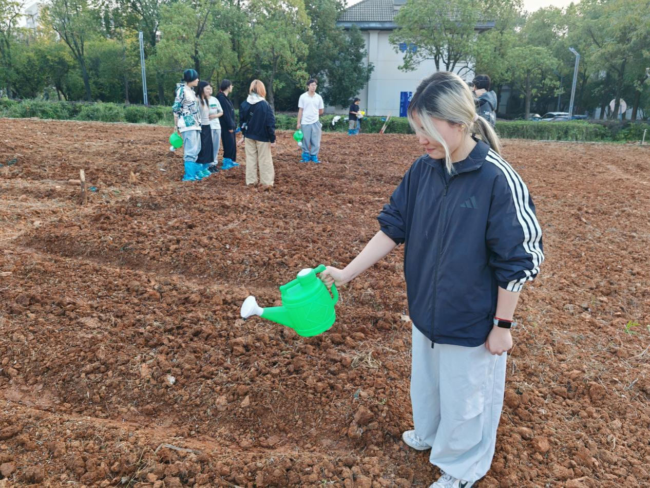 同学们手持农具踏入责任田。垦地环节,铁锹与泥土碰撞出劳动的序曲,大家分组协作,将荒地翻整成松软沃土。挖垄时,大家结合雕塑造型经验,精心设计垄沟走向,确保排水与采光兼顾。撒种环节,同学们蹲身轻撒,将希望与创意一同埋入土中;施肥时,大家严格遵循科学配比,细致均匀地将肥料融入土壤。