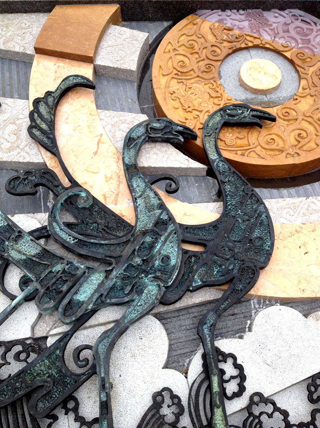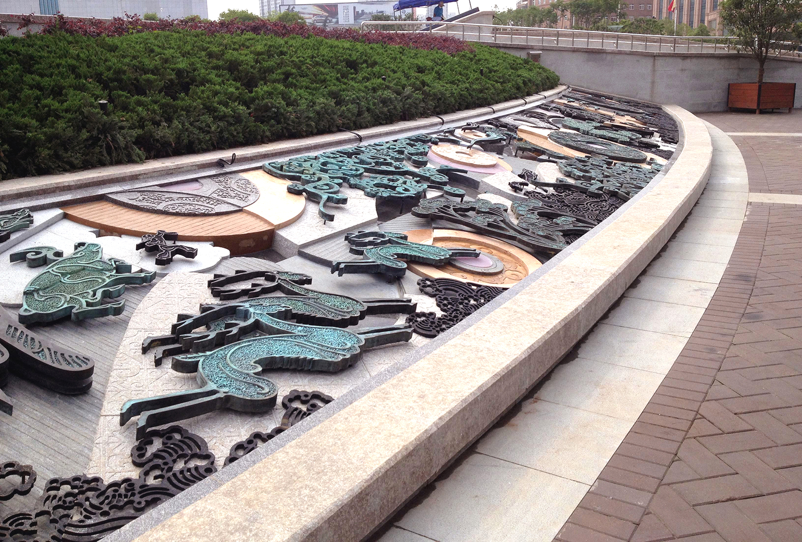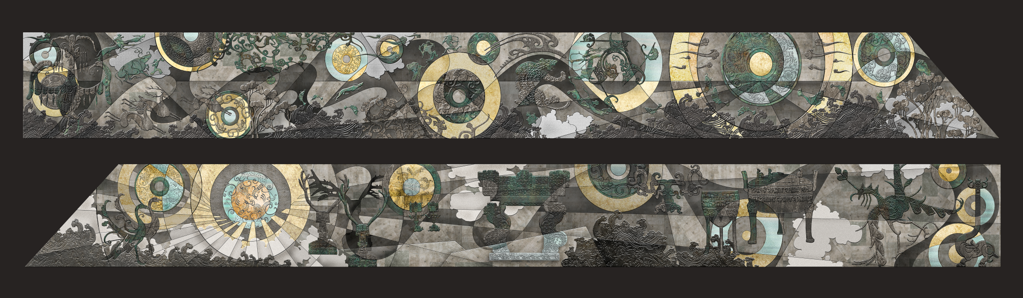 本次入选的浮雕壁画《楚风》装置于武汉市洪山广场。作品运用长卷构图形式展开,用夸张而富于浪漫意味的艺术符号结合现代壁画的构成法则,表现荆楚惊采绝艳、璨烂瑰丽的文明内核。画面运用提炼楚国标志性文化符号,层叠错落,喻意楚人的图腾福润山川、护佑子民,万物繁茂的景象。壁画装置于城市公共广场空间内,时刻传递出对优秀传统文化精神内核的继承发扬与创新性艺术表现。