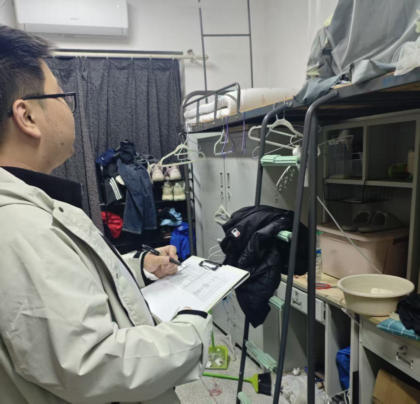 检查过程中,小组对宿舍内部及公共区域的清洁卫生情况进行了详细查看与评估。重点检查物品摆放是否整齐,垃圾是否及时清理,是否存在卫生死角,以及是否饲养宠物等违反宿舍管理规定的行为。吏希超老师与同学们交流时指出,整洁的居住环境不仅是个人健康生活的保障,也体现了大学生的精神风貌和集体责任感。他鼓励同学们建立并维护良好的宿舍内务轮值制度,共同创造窗明几净、舒适温馨的“小家”。