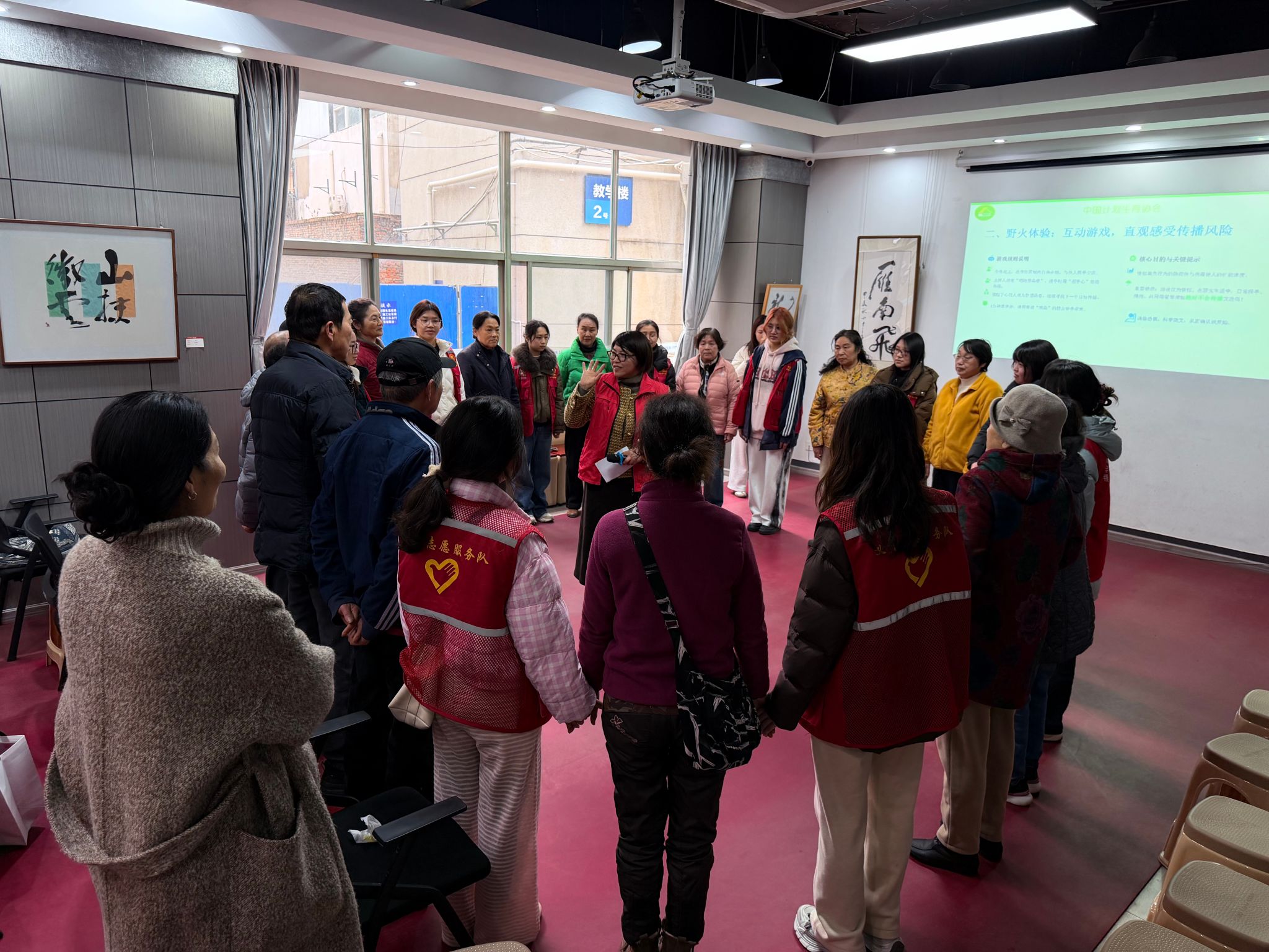 3月4日下午,学雷锋纪念日来临之际,湖北美术学院老干部活动中心里笑声不断。退休老教师和青年学生围成一个大圈,玩起了特别的“野火游戏”——通过三次握手模拟高风险行为后的病毒传播路径,让大家直观感受传染病传播之快、范围之广。