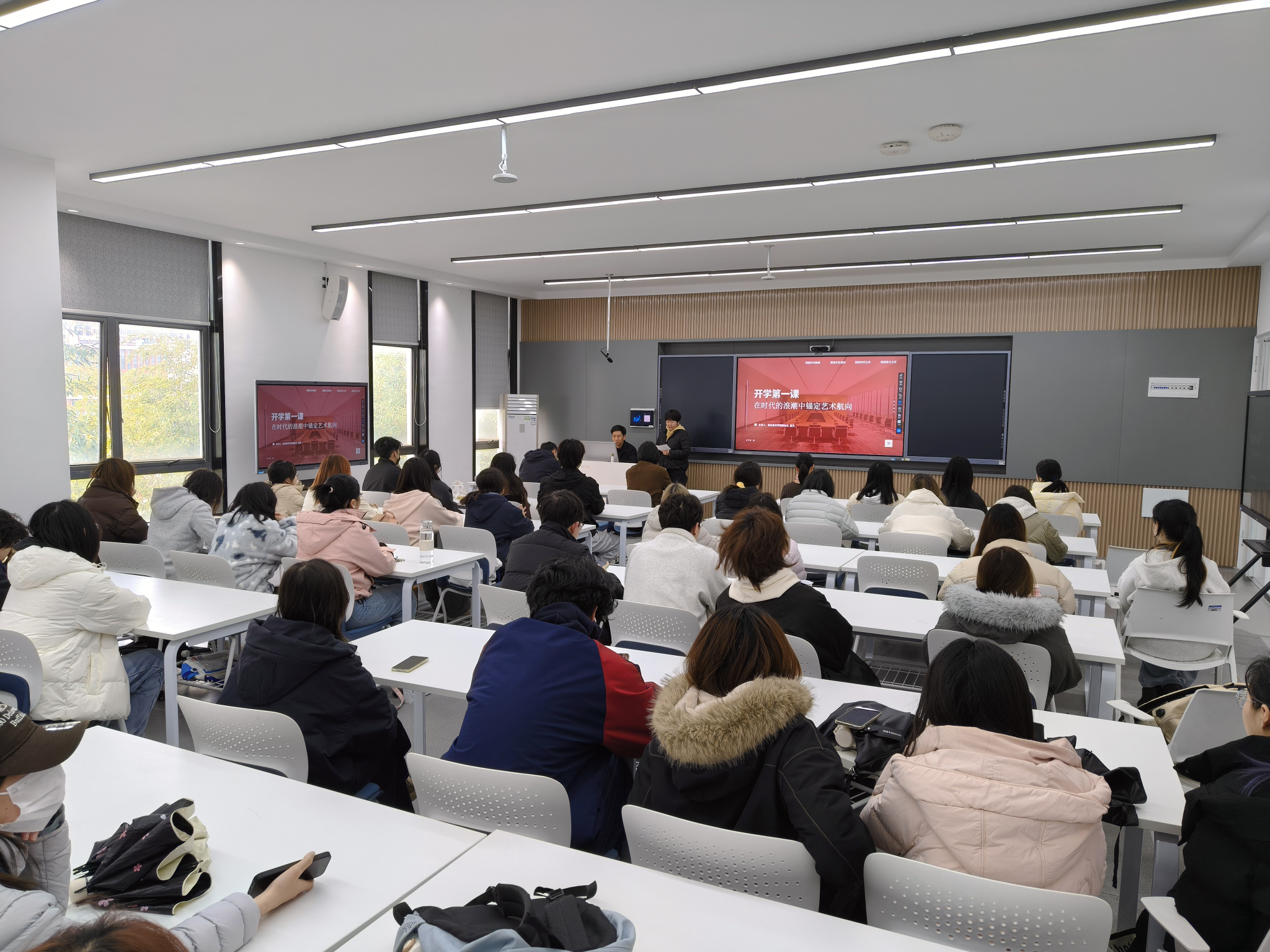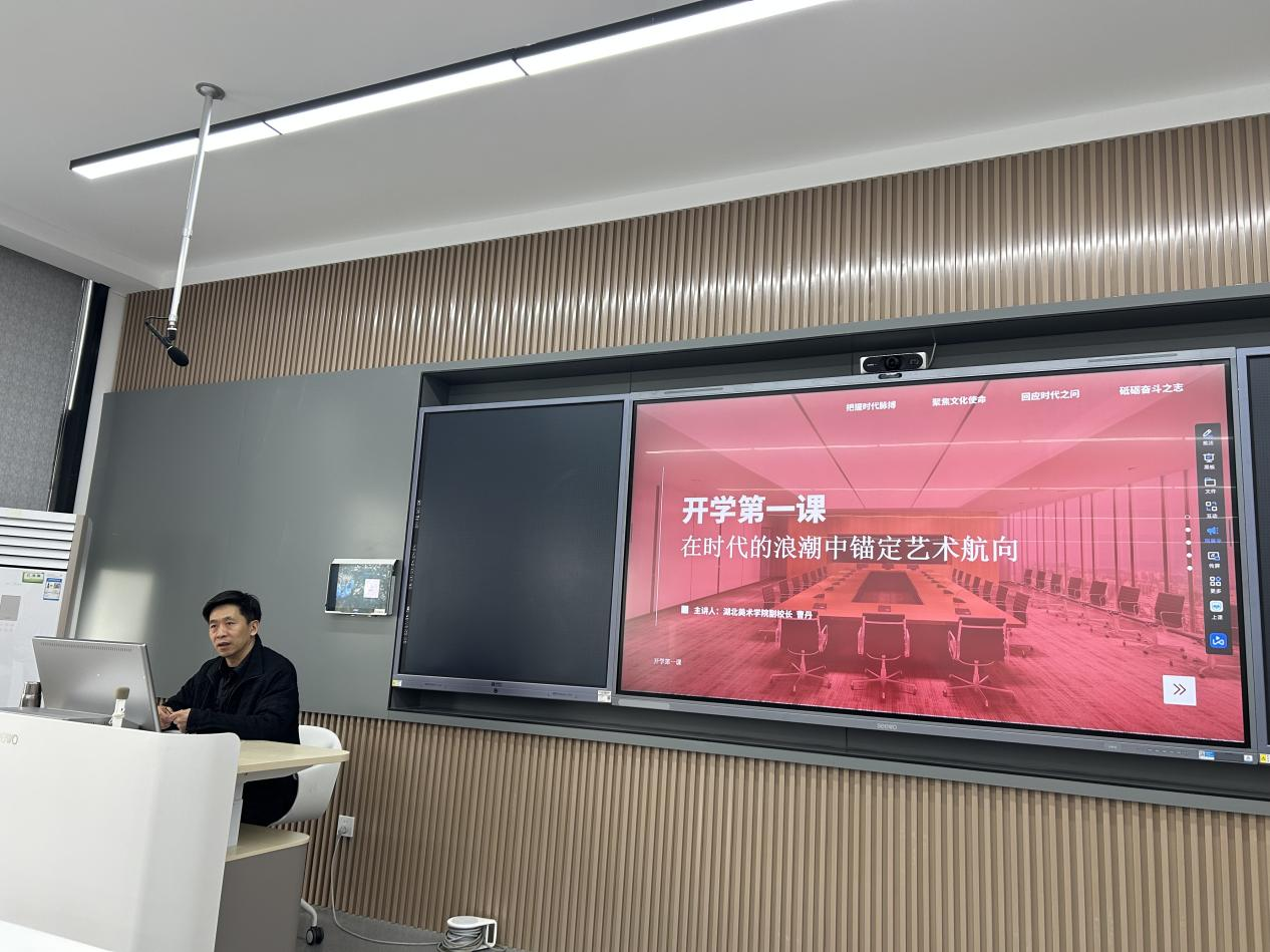 2026年3月18日15:30,湖北美术学院雕塑与公共艺术学院与工业设计学院2026年春季学期"开学第一课"在A6-202教室举行,60余名师生共同聆听了曹校长题为《在时代的浪潮中锚定艺术航向》的专题授课。“开学第一课”由雕塑与公共艺术学院党委书记罗远红主持。