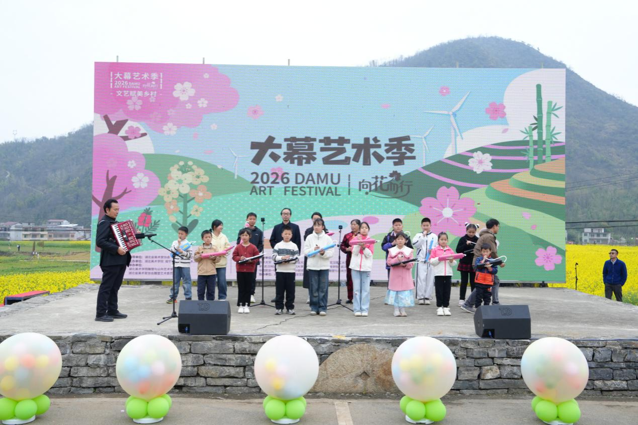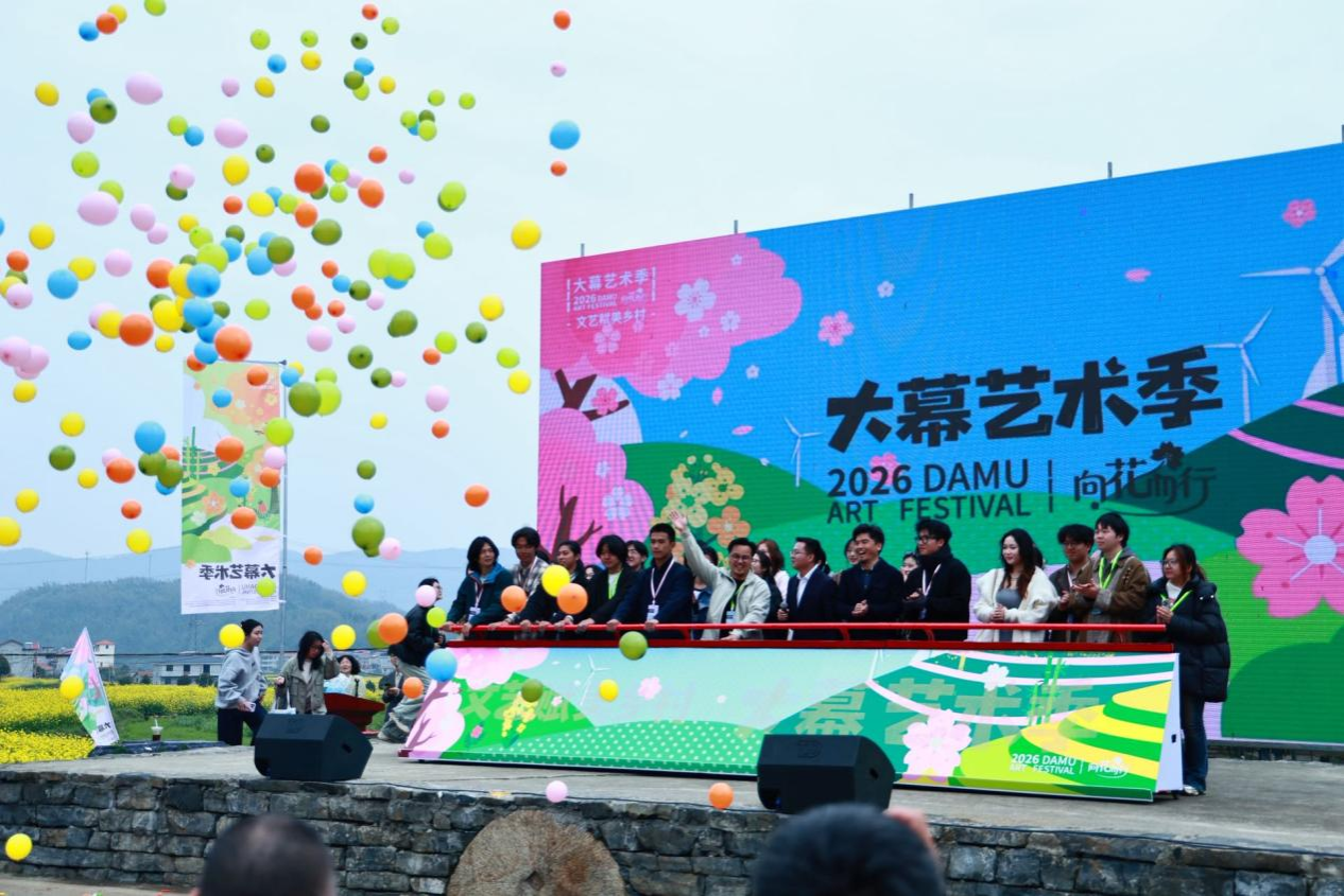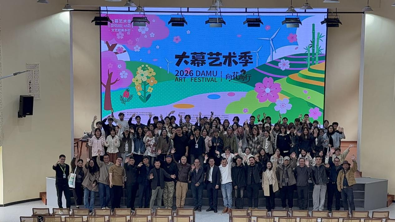 活动最后,由策展人朱广、刘义忠,大幕乡党委书记唐阳及全体学生共同宣布2026大幕艺术季正式启幕。