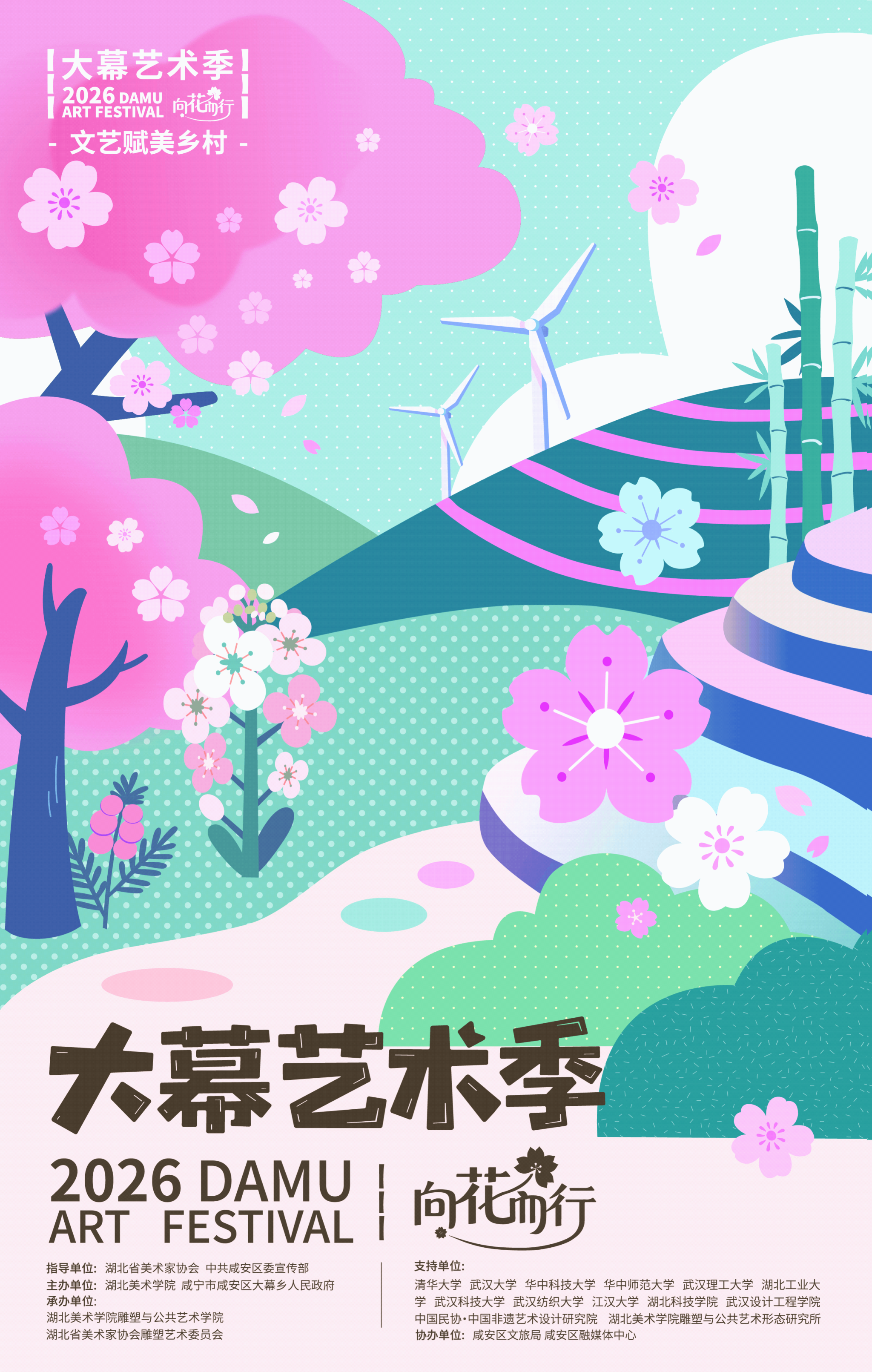 咸宁市咸安区大幕乡地处湖北省咸宁市咸安区,凭借良好生态资源及樱花、油菜花等季节性景观,是当地农文旅融合发展的核心区域。本次“文艺赋美乡村——2026大幕艺术季”以“向花而行”为主题,依托“艺塑乡村·荆楚新声——文艺赋美乡村主题工作营”,汇聚全国十二所高校88名学生组建跨学科创作团队。在当地村民参与支持下,创作团队历经4周驻地调研与在地创作,完成23件公共艺术作品。作品以乡村自然环境与在地材料为基底,深度挖掘大幕乡生态与文化特色,旨在将春季花期的自然流量转化为乡村发展持续动力,实现“以花引流、以艺留客、以文促产”,推动文化旅游、乡村产业与公共文化建设协同发展,打造具有影响力的“文艺赋美乡村”示范品牌。