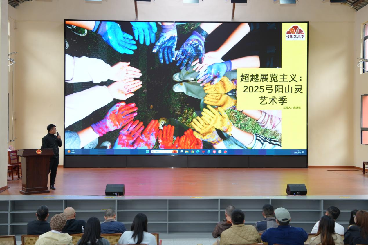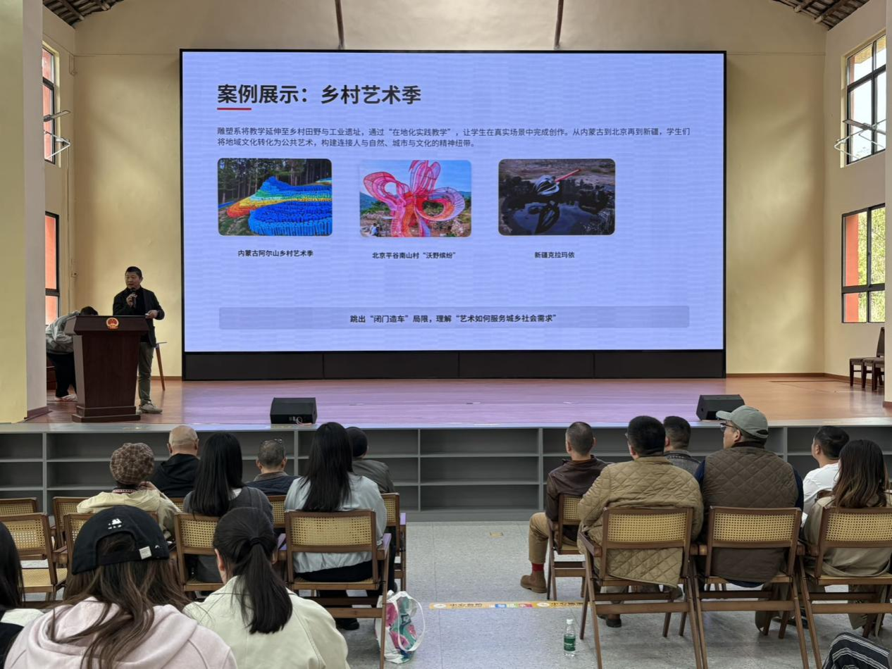 会上,多位专家学者分享了艺术赋能乡村的实践经验与研究成果:清华大学美术学院董书兵教授带来《荒野艺术计划》,陈辉教授作《广阔天地 大有作为 清华美院雕塑系教学实践成果汇报》;西安美术学院崔凯敏老师以《文艺赋能乡村振兴的关中探索——关中忙罢艺术节的实践》为题,分享了关中地区的实践样本;湖北省美术院项祎老师介绍了《橘颂艺术季》的在地实践;高满君博士则以《超越展览主义:2025弓阳山灵艺术季》为例,探讨公共艺术介入乡村的创新路径。