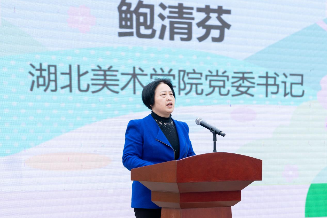 鲍书记在致辞中谈到,2021年,习近平总书记在清华大学考察时,深刻指出美术在服务经济社会发展中的重要价值,强调要将美术元素、艺术元素融入城乡规划建设,以美术成果赋能人民高品质生活。这为我们艺术教育工作者指明了方向,更赋予了我们沉甸甸的使命。今天,我们联合清华大学美术学院等十二所高校推进的实践项目,正是对总书记指示的生动践行。我们通过这次实践,让艺术之美与我们山河之美、人民之美相辅相成美美与共。站在新的起点,我们要以此次项目为契机,凝聚校际合力,深耕艺术实践,将湖美特色融入时代发展浪潮,为湖北加快建成中部地区崛起重要战略支点贡献湖美智慧与力量,共同绘就新时代艺术服务社会的精彩答卷!