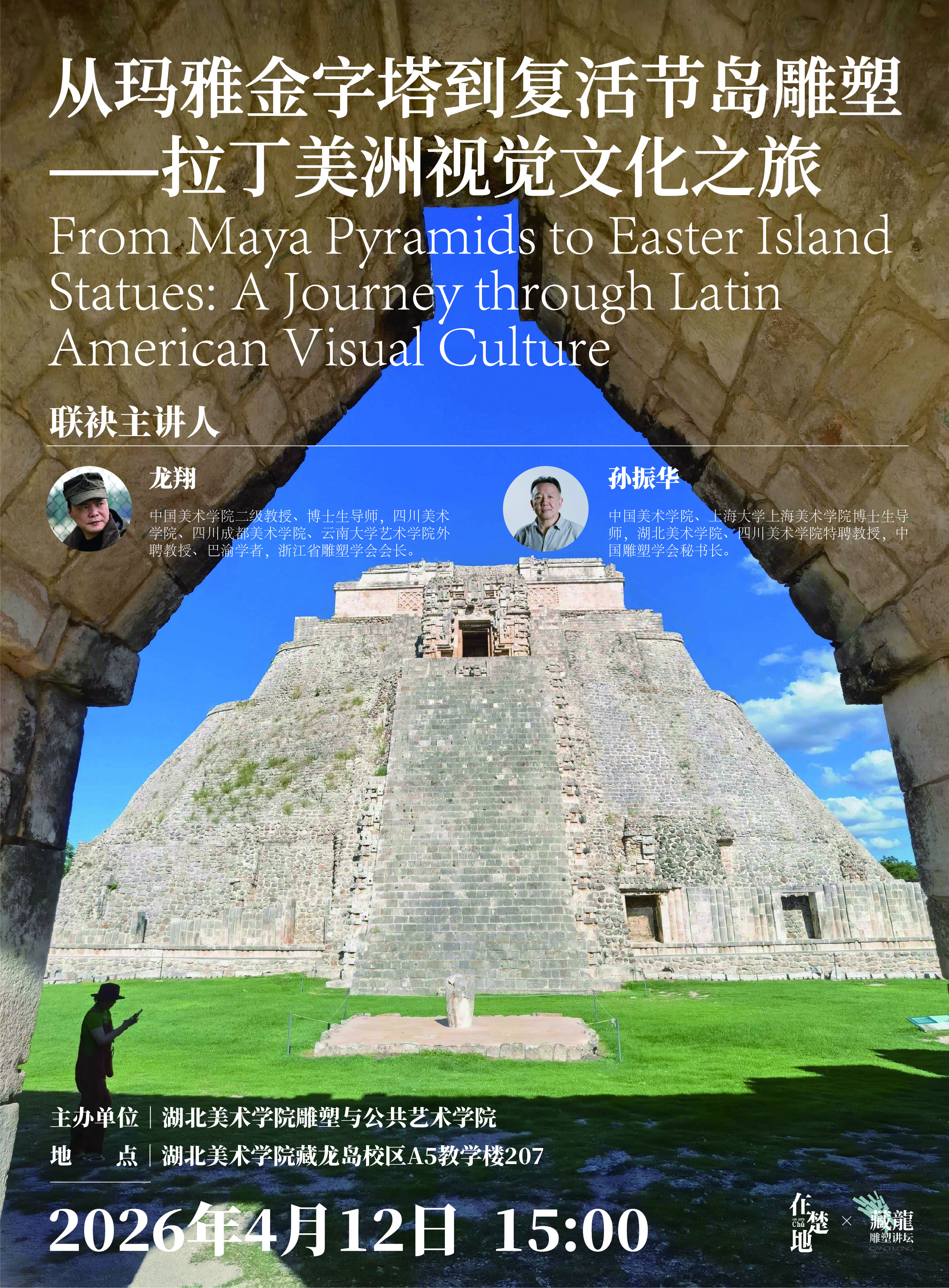 为拓宽师生跨文化艺术视野,深化学科理论研究,4月12日下午,湖北美术学院雕塑与公共艺术学院在藏龙岛校区举办《从玛雅金字塔到复活节岛雕塑——拉丁美洲视觉文化之旅》专题学术讲座。本次活动特邀中国美术学院龙翔教授、孙振华教授联袂主讲,学院众多师生到场聆听学习。