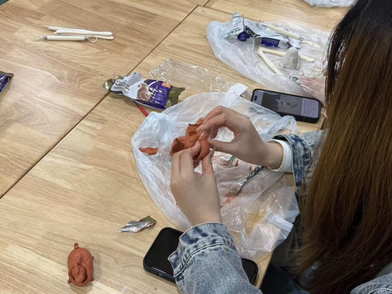 理论讲解结束后,实操环节正式开启。赵文颖手持工具现场示范,从揉土塑形到细节雕刻,每一步都细致入微。她特别强调楚地泥塑“以形写神”的创作理念,鼓励大家在塑造过程中融入个人理解与创意。随后,同学们领取材料,或低头构思造型,或动手尝试塑形,赵文颖则穿梭其间,针对造型比例、结构衔接等问题给予一对一指导。